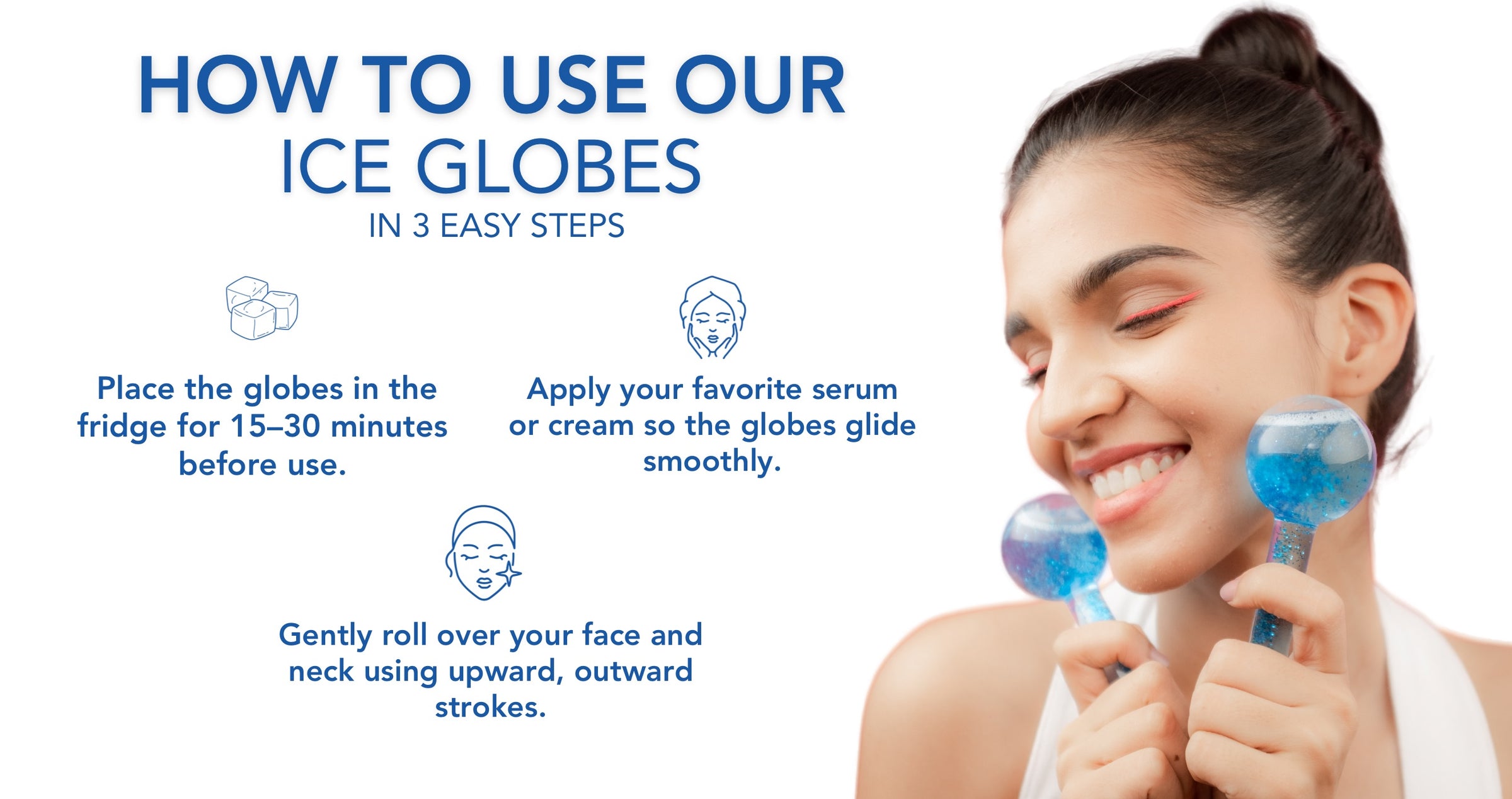 Store the Ice Globes in your fridge (not freezer) for at least 15 minutes before use. After each session, simply clean them with a gentle soap and lukewarm water. Wipe dry and place them back in the storage box.